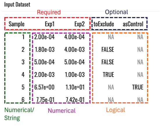 toExclude: Logical values to highlight which rows to excludeasControl: Logical values to highlight which rows represent control trialsFor the required Sample column, the data type is not restricted. Your values can be numbers or strings. Please avoid using logical values here without any additional strings appended to them.