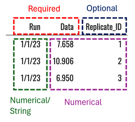 Replicate_ID: Category of replicates for the data beingFor the required Run column, the data type is not restricted. Your values can be numbers or strings. Please avoid using logical values here without any additional strings appended to them.